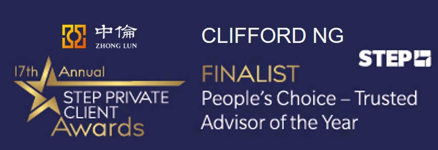 Zhong Lun is proud to announce that our partner of the Private Client Practice Clifford Ng has been shortlisted as one of the five finalists for “People’s Choice – Trusted Advisor of the Year” in the Private Client Awards of the Society of Trust and Estate Practitioners (STEP). The STEP Private Client Awards are widely acknowledged as the most prestigious awards in the industry and are rigorously judged by a worldwide panel of international experts and practitioners in the wealth management arena. A big thank to STEP for the nomination and our clients and intermediaries for their trust and support!