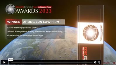 Zhong Lun is delighted that its Hong Kong Private Client Team took the “Triple Crown” at the WealthBriefingAsia Awards 2023 winning in the category of Estate Planning - Greater China with partners Clifford Ng named “Outstanding Individual” and Chloe Leung named “Wealth Management Rising Star Under 40”!