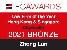 中伦深感荣幸香港办公室在《Citywealth》“2021国际金融中心大奖 年度最佳律师事务所- 香港及新加坡 项目中获得铜奖。这奖项表扬于主要国际金融中心的私人财富管理团队和顾问的卓越表现, 而评审过程是由国际备受推崇的专家评审结合公开投票的。